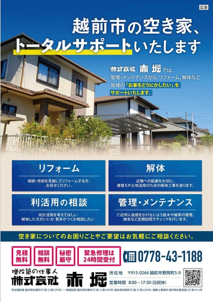こんにちは、越前市・鯖江市・池田町でリフォーム実績15年連続ランクイン、増改築の仕事人「株式会社赤堀」です。